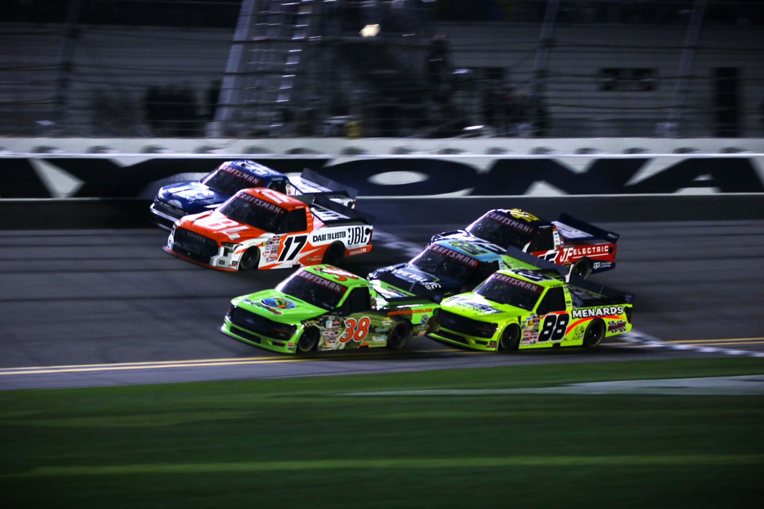 In order to grab the win, Smith had to execute a daring pass to the inside of three other trucks coming to the finish line. As John Hunter Nemechek attempted to defend against Gio Ruggiero and Christian Eckes, Smith drove his No. 38 Front Row Motorsports Ford along the bottom of the racing groove and to the lead. Seconds later, he crossed the finish line in first place as the aforementioned three drivers plus Ty Majeski finished four-wide behind him.