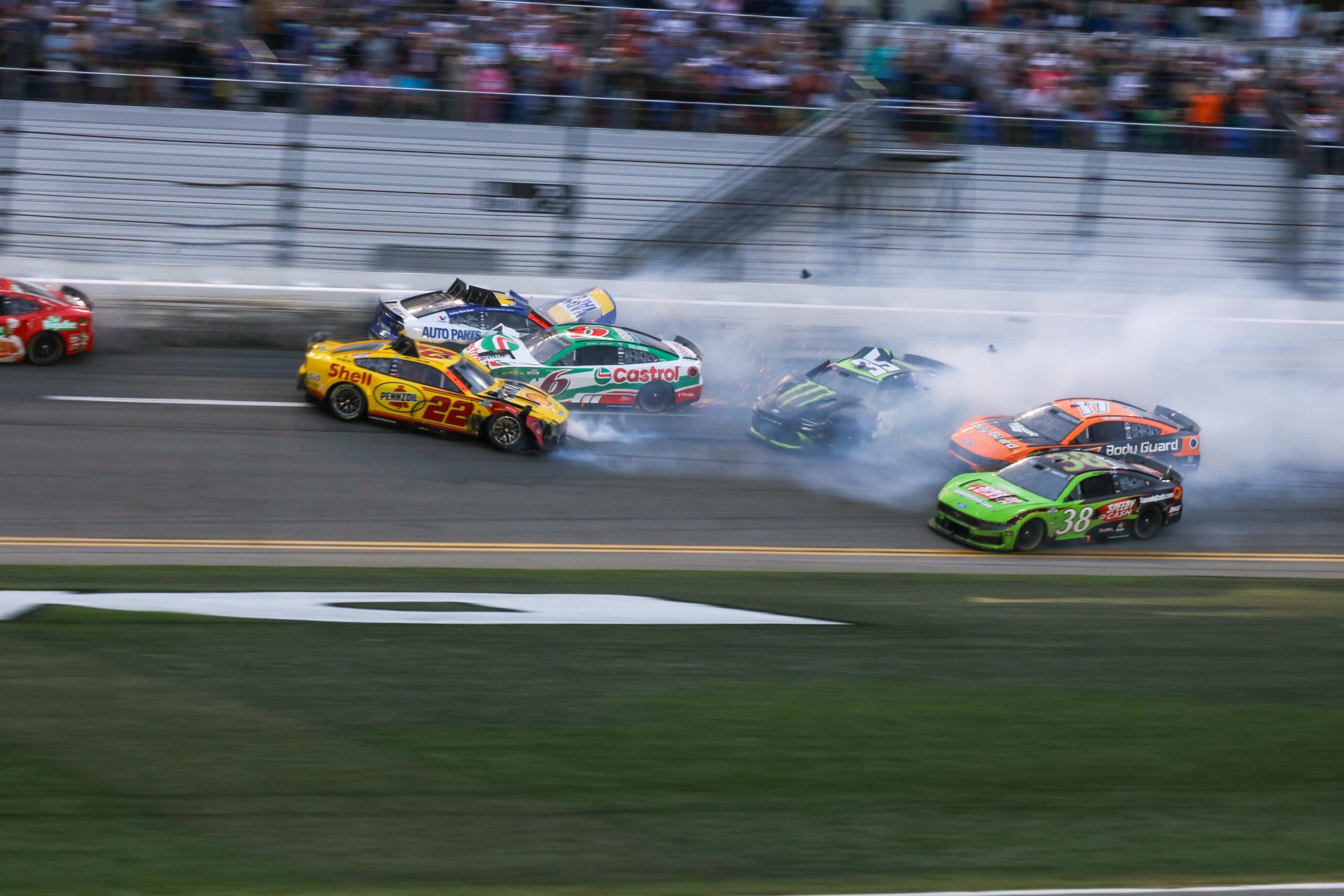 Ricky Stenhouse Jr. managed to finish second through the chaos, barely escaping unscathed in his No. 47 Chevrolet. Joey Logano finished third, despite his No. 22 Ford having begun to crash as he crossed the line. Elliott’s No. 9 Chevrolet was scored fourth, while Keselowski finished fifth in his No. 6 Ford.
